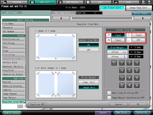 Use this function to print the lines indicating the trim size (corner crop marks) along with image data stored in a hold job. Also, lines indicating the center of the image (center crop marks) can be printed on the head and foot of the page.