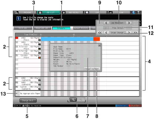 4 | Job bar display | Displays the reserved job with blue, yellow or orange bar according to the rules below: - Blue: Available for output with plenty of paper. - Yellow: Short supply of paper. - Orange: Highly likely to stop due to lack of paper, no appropriate paper loaded, or unavailable for output due to a different paper setting specified. When using multiple trays for one job, multiple bars are displayed. The background of each job is displayed in gray shading so you can determine the end of each job. |