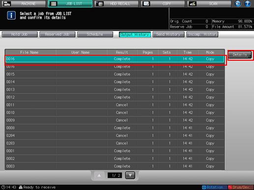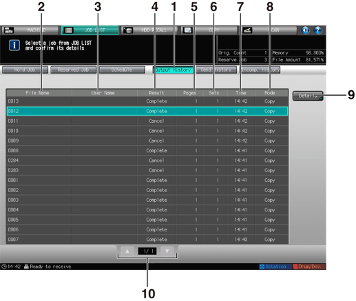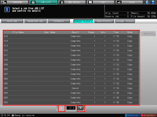 Press [JOB LIST] tab on the screen, then press [Output History].