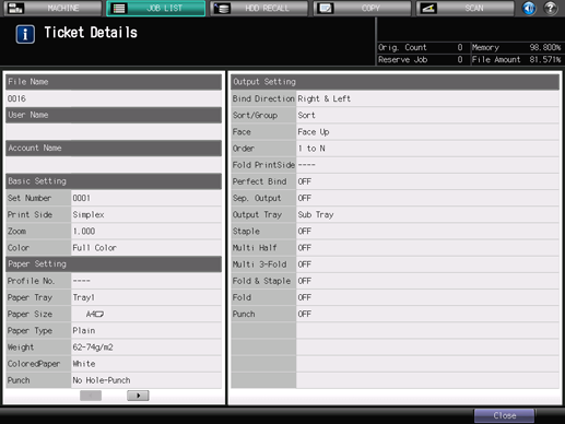 9 | [Details] | Pressed for a job to be checked in detail after you select it from the list. The [Ticket Details] screen for the selected job is displayed. |