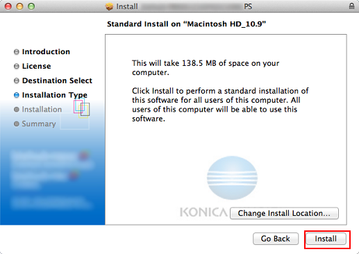 Click [Continue] following the instructions on the windows that follow until the [Install] window is displayed.