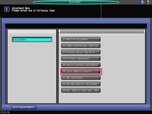 On the touch panel of the machine, press [Adjustment] on the [MACHINE] screen, and then press [Color Density Control] on the [Adjustment Menu] screen.