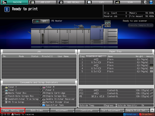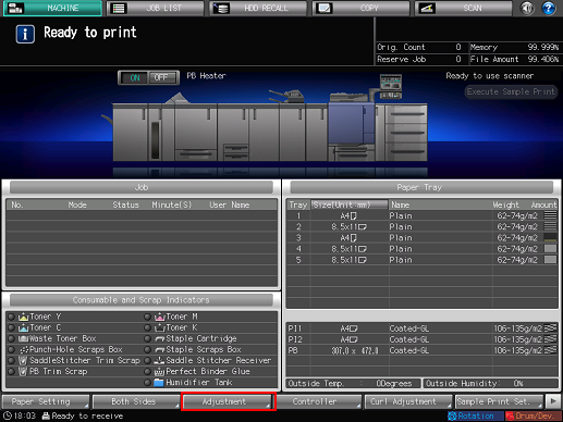 On the touch panel of the main body, press [Adjustment] on the [MACHINE] screen.