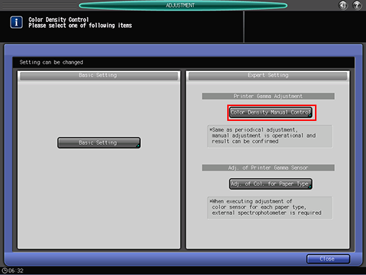 With the RU option, manual calibration is unnecessary. Note that in that case, on the touch panel of the main body, press [Adjustment] - [Color Density Control] - [Basic Setting], and then set [Periodical Adj. Execution] to [ON].