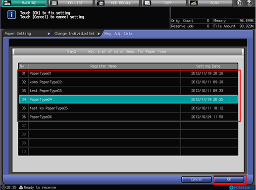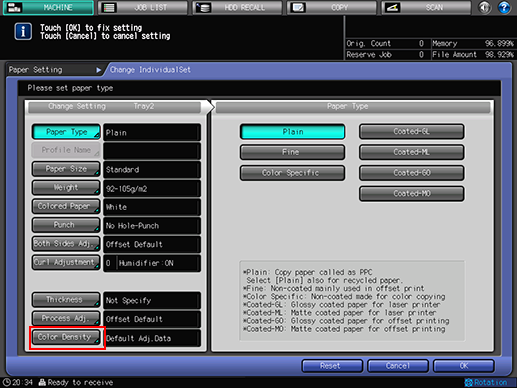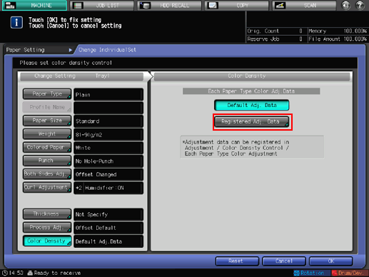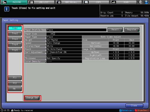 Select the tray to which the adjusted color density is applied, and press [Change Set].
