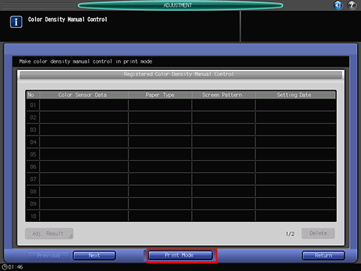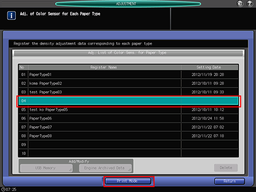 Select the number where the output density control value is to be registered and press [Print Mode].