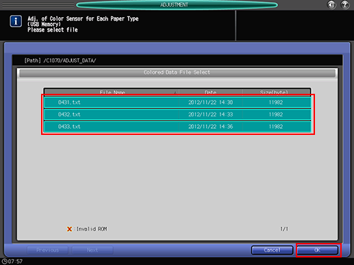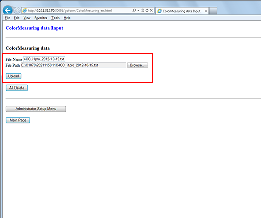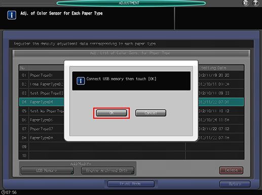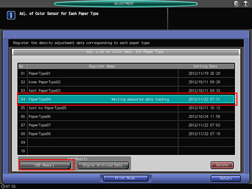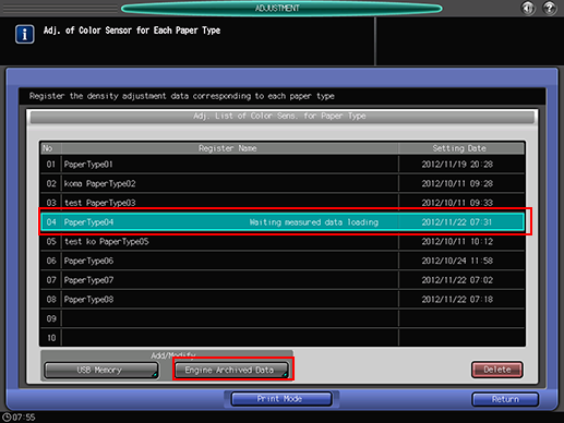 You can register the measured data (color density value for each paper type) saved in the USB memory or the computer on the network into the machine.