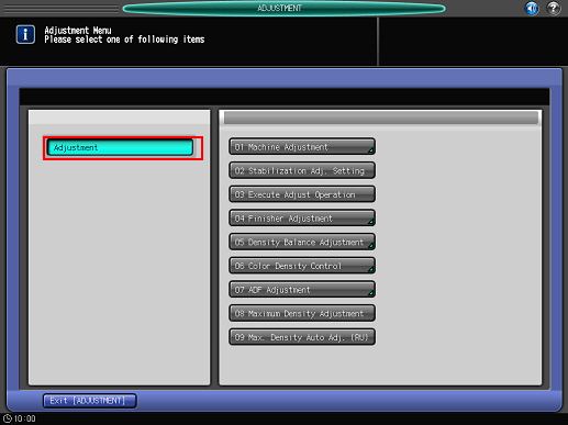 Press [Adjustment] on the [MACHINE] screen to display the [Adjustment Menu] screen.