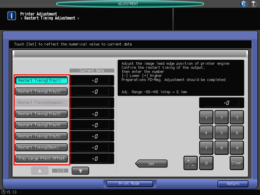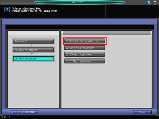 Press [Machine Adjustment], [Printer Adjustment], and [Restart Timing Adjustment] in sequence.