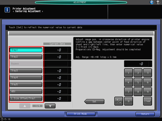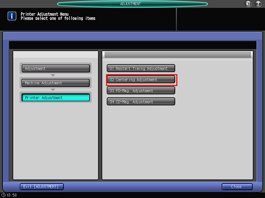 Press [Machine Adjustment], [Printer Adjustment], and [Centering Adjustment] in sequence.
