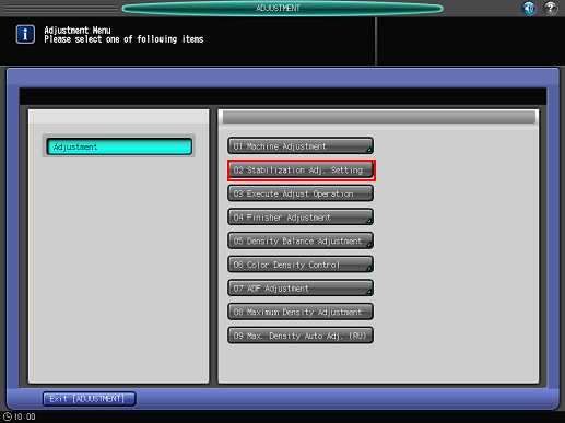 Press [Adjustment] on the [MACHINE] screen to display the [Adjustment Menu] screen.
