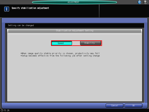 If you select the [quality stability], you can set a density adjustment frequency using Administrator Setting. Refer to Stabilization Adj. Setting: Selecting Priority of Output Speed and Image Quality for details.