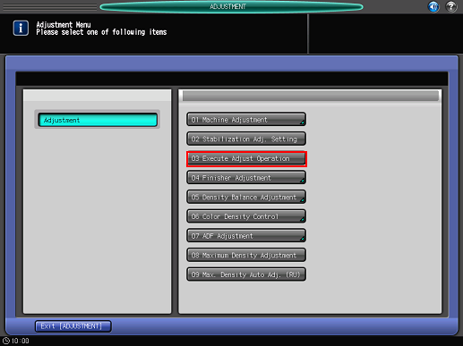 Press [OK], then press [Exit [ADJUSTMENT]] on the [Adjustment Menu] screen. After exiting the [Adjustment Menu] screen, the machine starts the adjustment operation.