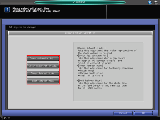 Carry out the adjustment operation in Gamma Automatic Adjustment, Color Registration Adj., Toner Refresh, and Belt Refresh modes.