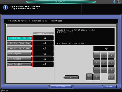 3. Select [2 Position Pitch(120mm)], [2 Position Pitch(140mm)], [2 Position Pitch(165mm)], [Rear Diagonal], [Rear Parallel], or [Front Parallel] to adjust the staple position.