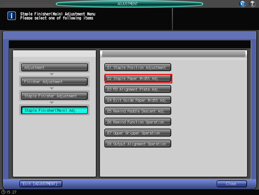 Press [Finisher Adjustment], [Staple Finisher Adjustment], [Staple Finisher(Main) Adj.], and [Staple Paper Width Adj.] in sequence.