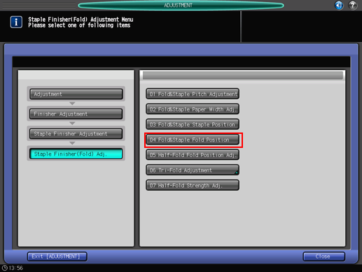 Press [Finisher Adjustment], [Staple Finisher Adjustment], [Staple Finisher(Fold) Adj.], and [Fold&Staple Fold Position] in sequence.