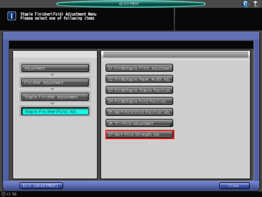 Press [Finisher Adjustment], [Staple Finisher Adjustment], [Staple Finisher(Fold) Adj.], and [Half-Fold Strength Adj.] in sequence.