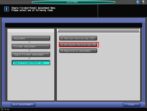 Press [Finisher Adjustment], [Staple Finisher Adjustment], [Staple Finisher(Punch) Adj.], and [Horizontal Position Adj.(FD)] in sequence.