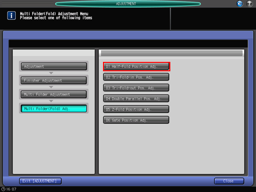 2. Press [Finisher Adjustment], [Multi Folder Adjustment], [Multi Folder (Fold) Adj.], and [Half-Fold Position Adj.] in sequence.