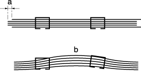 7. Check if the stapled set shows misalignment (a) (caused if specified paper width is larger than the actual width), or is curved (b) (caused if specified paper width is smaller than the actual width).