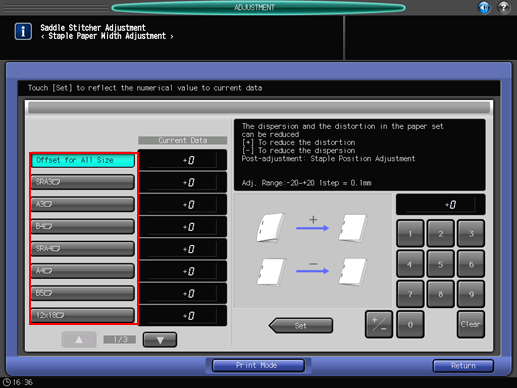 Objects of Adjustment: Offset for All Size, SRA3 , A3 , B4 , SRA4 , A4 , B5 , 12 18 , 11 17 , 8.5 14 , 8.5 11 , 8.125 13.25 , 8.5 13 , 8.25 13 , 8 13 , 8K , 16K , Custom (380 - 463 mm), Custom (257 - 379 mm)