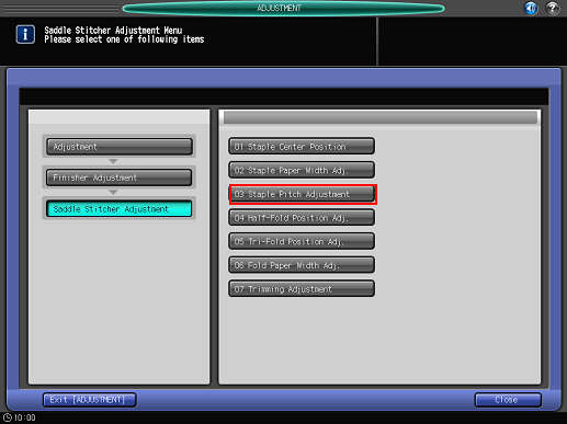 Press [Finisher Adjustment], [Saddle Stitcher Adjustment], and [Staple Pitch Adjustment] in sequence.
