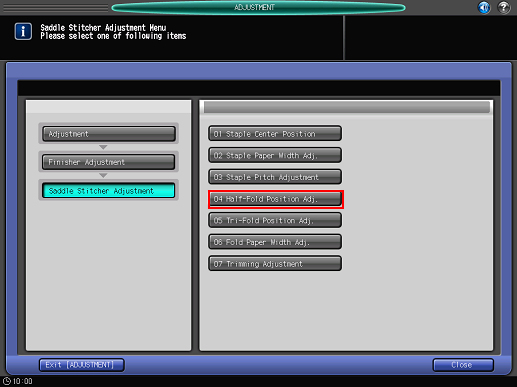 Press [Finisher Adjustment], [Saddle Stitcher Adjustment], and [Half-Fold Position Adj.] in sequence.