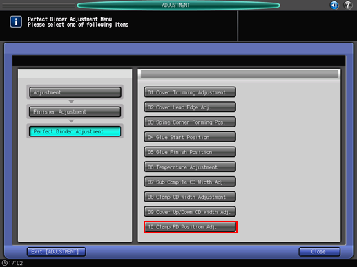 Press [Finisher Adjustment], [Perfect Binder Adjustment], and [Clamp FD Position Adj.] in sequence.