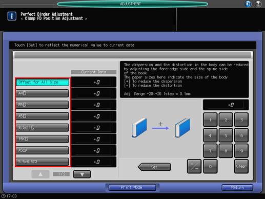 If a numeric value is specified for [Offset for All Size], it is applied to all paper sizes. With a specific paper size selected,the set value becomes the sum of the entered value and the value previously specified for [Offset for All Size].