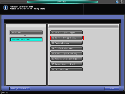 Press [Finisher Adjustment] and [Half-Fold Stopper Adj.] in sequence.