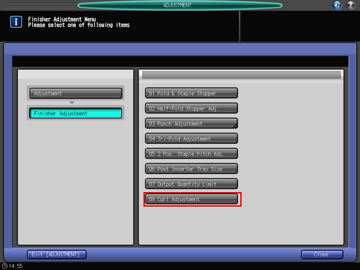 If the machine is mounted with Finisher FS-531 or Finisher FS-612 without Relay Unit RU-509 mounted, [Curl Adjustment] is displayed on the [Finisher Adjustment Menu] screen accessed from the [Adjustment Menu] screen.