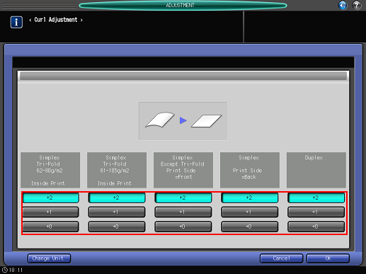 Set the curl adjustment to be performed in the decurling section of the machine for Simplex, Duplex, and Tri-Fold (inside print) modes (Finisher FS-612 only).