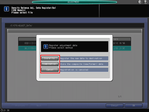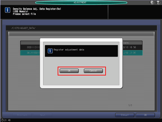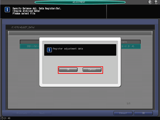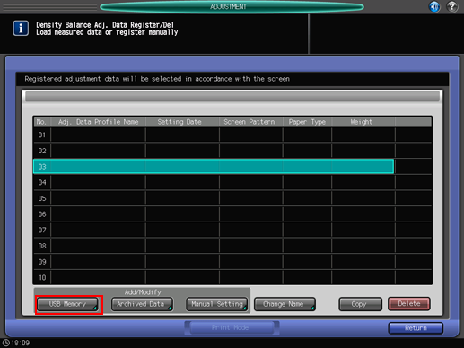 Press [Density Balance Data Reg/Del] on the [Density Balance Adjustment Menu] screen to display the [Density Balance Adj. Data Register/Del] screen.