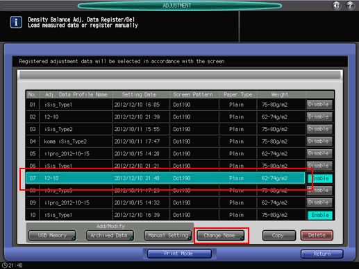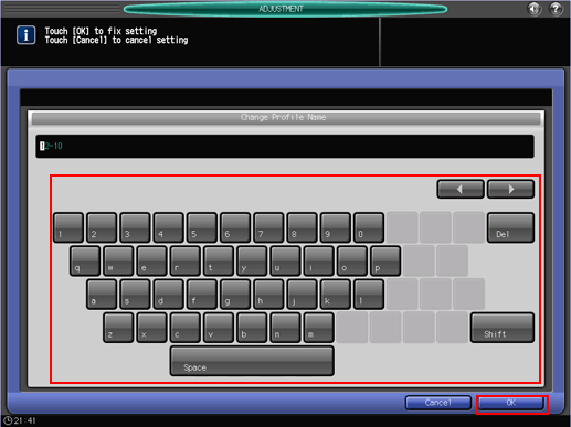 You can change the Adj. Data Profile Name, if desired. Press [Change Name] to display the [Change Profile Name] screen. Enter the desired profile name, then press [OK].