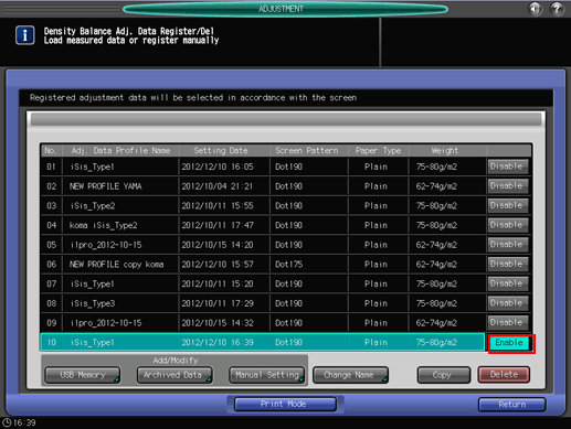 If multiple pieces of adjustment data are set for the same screen type, paper type, and weight, set [Enable] for the desired one. Others are automatically set to [Disable].