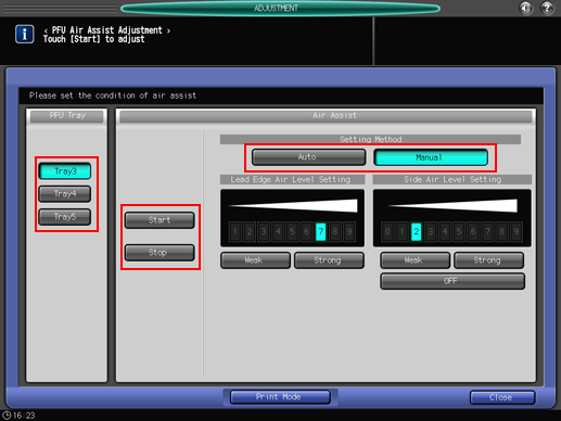 Do not open theĀ air nozzle confirmation window of the tray 3. To make the Air Assist settings for tray 3, manually configure the settings for another tray than tray 3, then set the same adjustment value.