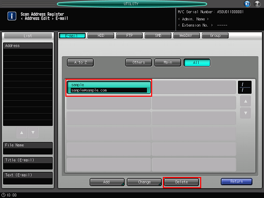 Press [E-mail], [HDD], [FTP], [SMB], [WebDAV], or [Group] to display a destination to delete.