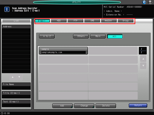 Press [E-mail], [HDD], [FTP], [SMB], [WebDAV], or [Group] to display a destination to change its information.