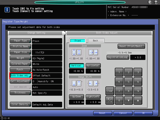 If you change the [Zoom] setting for [Front] or [Back], [Image Shift] setting, or [Registration Loop setting], the Both Sides Adjust indication changes to [Offset Changed].