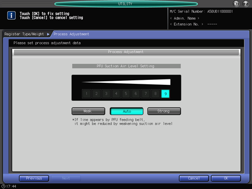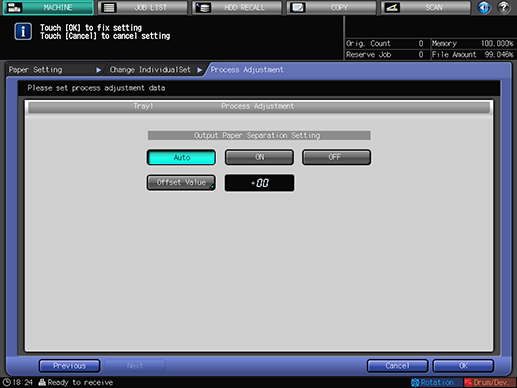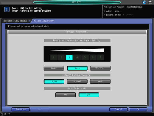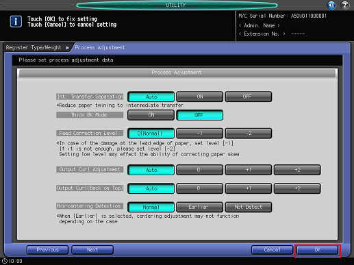 Process Adjustment is not displayed by default. If you wish to use the Process Adjustment function in paper setting, contact your service representative.