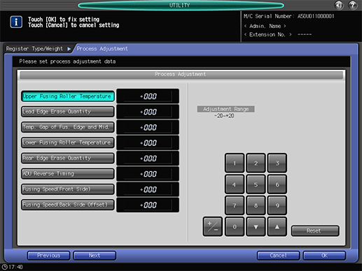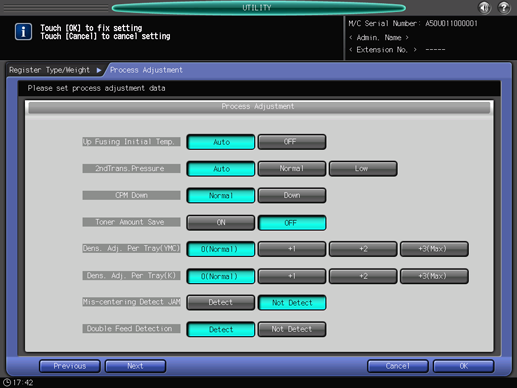 Process Adjustment | Process adjustment of transfer/separation/fusing and Up Fusing Initial Temp., 2ndTrans.Pressure, CPM Down, Toner Amount Save, Dens. Adj. Per Tray (YMC), Dens. Adj. Per Tray (K), Mis-centering Detect JAM, Double Feed Detection1, Int. Transfer Separation, Thick BK Mode, Feed Correction Level, Output Curl Adjustment, Back on Top Output Curl Adj., Mis-centering Detection, Fusing Air Separation Air Level Setting, Change Fusing Pressure, Hard Paper Mode, PFU Suction Air Level Setting2, and Output Paper Separation Setting3 are available. For details about the Mis-centering Detect JAM, refer to Print Job JAM Setting: Setting the Detection of Paper Jam Caused by Misalignment. *1: This menu item is to be displayed on the machine mounted with Paper Feeder Unit PF-602m or Feeder Unit PF-707. *2: This menu item is to be displayed on the machine mounted with Paper Feeder Unit PF-707. *3: This menu item is to be displayed on the machine mounted with Relay Unit RU-516 / Relay Unit RU-517. [Process Adjustment] is not displayed by default. Contact your service representative. | 2nd Transfer Output Adj. (Front): -50 to +50 2nd Transfer Output Adj. (Back): -50 to +50 2nd Transfer-Lead Edge (Front): -50 to +50 2nd Transfer-Lead Edge (Back): -50 to +50 2nd Transfer-Rear Edge (Front): -50 to +50 2nd Transfer-Rear Edge (Back): -50 to +50 Separation AC (Front): -600 to +600 Separation AC (Back): -600 to +600 Separation DC (Front): -60 to +60 Separation DC (Back): -60 to +60 Upper Fusing Roller Temperature: -20 to +20 Lead Edge Erase Quantity: 0 to +200 Temp. Gap of Fus. Edge and Mid.: -10 to +10 Lower Fusing Roller Temperature: -15 to +10 Rear Edge Erase Quantity: 0 to +200 ADU Reverse Timing: -6 to +6 Fusing Speed (Front Side): -200 to +200 Fusing Speed (Back Side Offset): -200 to +200 Up Fusing Initial Temp.: Auto, OFF 2ndTrans.Pressure: Auto, Normal, Low CPM Down: Normal, Down Toner Amount Save: ON, OFF Dens. Adj. Per Tray (YMC): 0 (standard), +1, +2, +3 (Max.) Dens. Adj. Per Tray (K): 0 (standard), +1, +2, +3 (Max.) Mis-centering Detect JAM: Detect, Not Detect Double Feed Detection1: Detect, Not Detect Int. Transfer Separation: Auto, ON, OFF Thick BK Mode: ON, OFF Feed Correction Level: 0 (Normal), -1, -2 Output Curl Adjustment: Auto, 0, +1, +2 Output Curl (Back on Top): Auto, 0, +1, +2 Mis-centering Detection: Standard, Quick, Not Detect Fusing Air Separation Air Level Setting: 1 (Weak) to 7 (Strong), Auto (3) Change Fusing Pressure: Auto, Normal, Low Hard Paper Mode: ON, OFF PFU Suction Air Level Setting2: 1 (Weak) to 9 (Strong), Auto Output Paper Separation Setting3: Auto (-50~+50), ON (-50~+50), OFF |