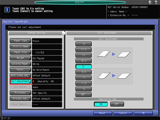 Curl Adjustment | The machine mounted with the optional Relay Unit RU-509 provides [Curl Adjustment] on the screen, which allows you to correct the curl (arc-like distortion) of output paper. Also, switching [ON] and [OFF] for Humidifier Setting is available if the relay unit is equipped with Humidifier HM-102. | Curl Adjustment: -2, -1.5, -1, -0.5, 0, +0.5, +1, +1.5, +2, OFF Humidifier Setting: ON, OFF |