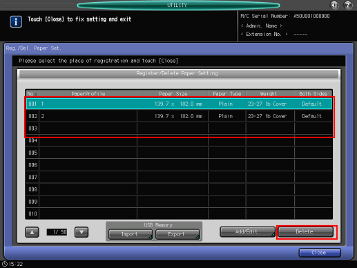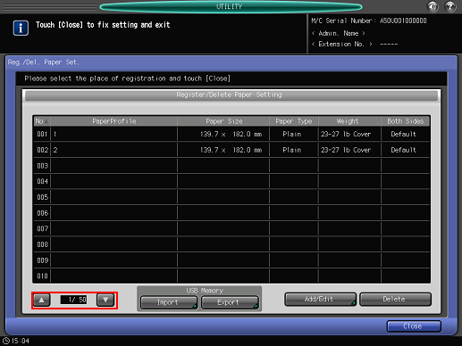 In each case, the screen returns to the [Register/Delete Paper Setting] screen.