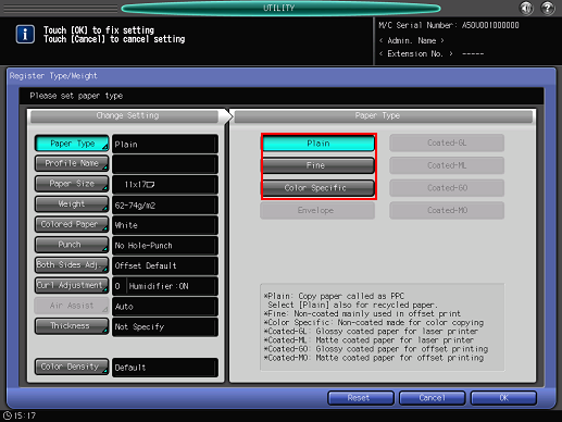 Paper Type | The following seven paper types are provided according to the plainness of paper. | Plain, Fine, Color Specific, Coated-GL, Coated-ML, Coated-GO, Coated-MO |