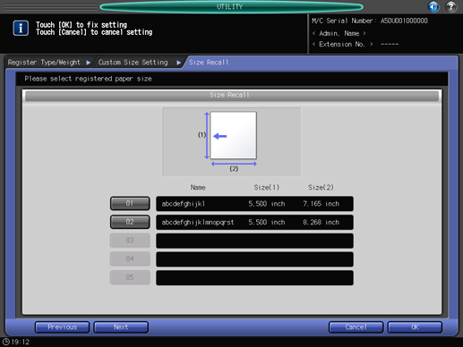 Use [Previous] and [Next] to scroll to the desired custom size. Entries from [01] to [20] are provided on the screen.