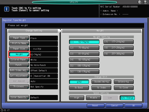 Weight | Select one from 9 types provided on the screen. Four types of coated paper become available when the weight over 81 g/m2 / 22 lb Bond is selected. The unit of weight can be switched. The unit used to register the condition is also used to display that condition on the [MACHINE] screen and the [COPY] screen when called. The speed can be set to High for the paper weight of 176 g/m2 / 47 lb Bond or less. The speed can be set to Low for the paper weight of 177 g/m2 / 48 lb Bond or more. | Weight Setting: 62-74 g/m2 / 16-19 lb Bond 75-80g/m2 / 20-21 lb Bond 81-91g/m2 / 22-24 lb Bond 92-105g/m2 / 25-28 lb Bond 106-135g/m2 / 29-36 lb Bond 136-176g/m2 / 37-47 lb Bond 177-216g/m2 / 48-57 lb Bond 217-256g/m2 / 58-68 lb Bond 257-300g/m2 / 69-81 lb Bond Change Unit: g/m2, Duodecimo-Kg, Octavo-Kg, lb Bond, lb Index, lb Cover Speed Setting: High, Middle, Low, Auto Change |