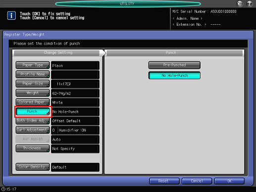 Select [Pre-Punched] for punched paper, or select [No Hole-Punch] for paper without punch holes.