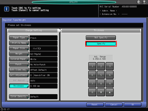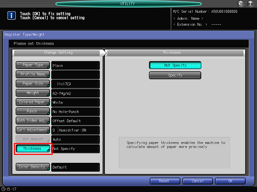 Thickness | The machine mounted with Image Controller IC-602 provides [Thickness] on the screen, and selecting [Specify] allows the machine to estimate the remaining amount of paper in the tray with greater accuracy. When Banner mode is enabled, [Thickness] are not displayed. | Not Specify, Specify Adjustment Range: 0.050 mm to 0.500 mm |