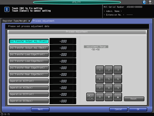 For the items from [2nd Transfer Output Adj. (Front)] to [Fusing Speed Adjustment] displayed by pressing [Next], select the button for the item you want to adjust and press the touch panel keypad, [